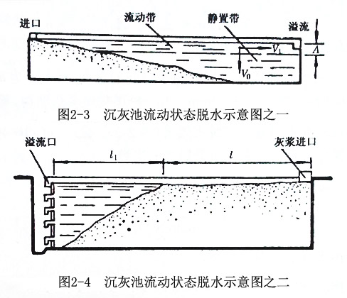 灰水流動狀態的脫水是灰水由沉灰池的一端進入,澄清水由另一端溢流排出的連續作業,灰粒在灰水流中邊流動邊沉降。在沉灰池中灰水分為兩帶,上層灰水流動部分稱為流動帶,下層靜止沉降積灰部分稱為靜置帶(圖2-3和圖2-4)。沉灰池中粗、重顆粒,由于水力沉速快,穿過運動帶的時間很短,被灰水流攜帶向溢流口移動的距離也很短,故在沉灰池進口處快速沉降,而形成一個坡向溢流口的斜面。灰水不斷引進,澄清水溢流,斜面積灰層逐漸增高,待溢流水中含灰量超過允許限度(<0.1)時就關閉灰水進口閘門,再靜置一段時間后,入出澄清水就可以挖灰使用。