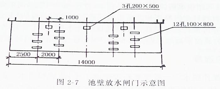 進(jìn)灰水渠道斷面為50cm×70cm,總長(zhǎng)200m。池壁放水閘門(mén)(圖2-7)由標(biāo)高0.3m開(kāi)始,每隔0.2m設(shè)兩個(gè)0.1m×0.8m的排水孔,及標(biāo)高0.5m、0.7m、0.9m、1.1m和1.3m處各設(shè)兩個(gè)。標(biāo)高1.5m處設(shè)三個(gè)0.2m×0.5m的排水孔。排水管道190m,井點(diǎn)抽水設(shè)備兩套。